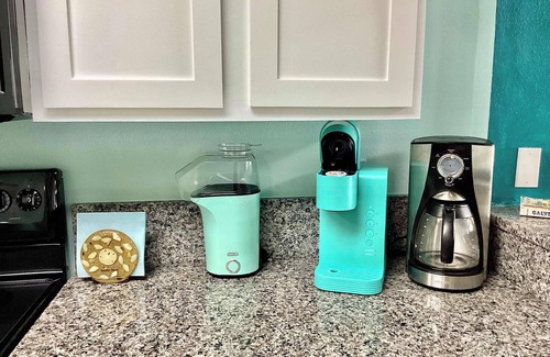 Inside, the condo invites you to unwind in a stylish living room with a smart TV, cozy couch, and two armchairs—perfect for movie nights or lounging after exploring Galveston’s historic downtown or family-friendly attractions like Moody Gardens and Schlitterbahn. The fully equipped kitchen is designed for convenience with black appliances, a stackable washer and dryer, a fun popcorn maker, and both drip and single-cup coffee makers, while counter seating for two creates the perfect breakfast spot. Share meals or play board games at the dining table for six, or step out onto the private balcony with seating for four and enjoy panoramic waterfront views at sunset. And of course, beach essentials are provided, making it effortless to head out for a day by the water.