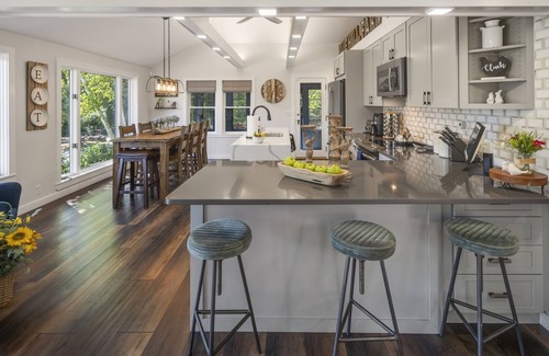 ⭑ Fully equipped gourmet kitchen and spacious dining room with cathedral ceilings and exposed beams