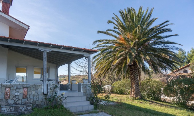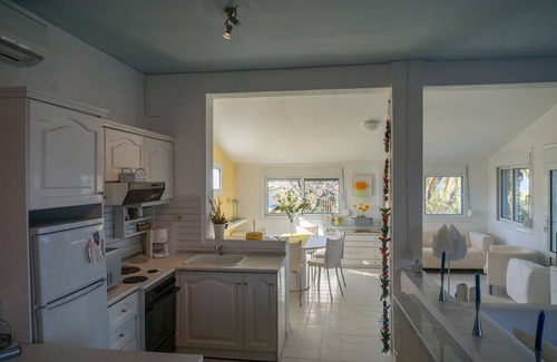 Perched on the top of a hillside overlooking the village of Chanioti at the tip of the Kassandra peninsula with great sea views, is this two bedroom apartment; Tastefully decorated it includes a fully equipped kitchen, one large double bedroom and one twin bedroom. The guests will also enjoy barbecue facilities as well as shared grounds and a basketball court with another two units. It can also be rented together with Blue Horizon 1(VRBO #4423322) and 3(VRBO #4424707), accommodating up to 16 people.