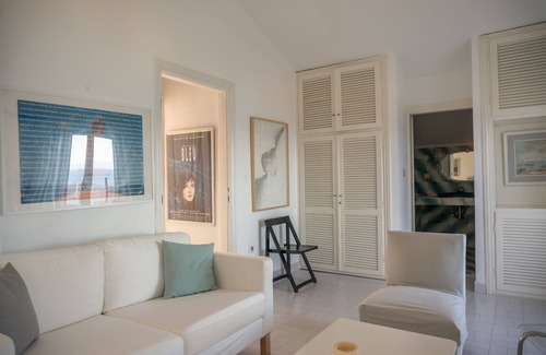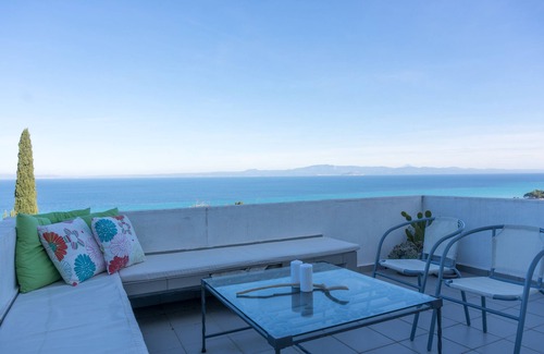 A great first floor 1 bed apartment perched at the edge of a cliff and able to accommodate a family of four people. Its view to the sea and the Chanioti village below is spectacular. Recently renovated, it offers all the amenities you need for a great stay!! For larger Groups it can be booked with Blue Horizon 1(VRBO #4423322) and 2 (VRBO #4424696), the complex can cater for 16 people in total.
