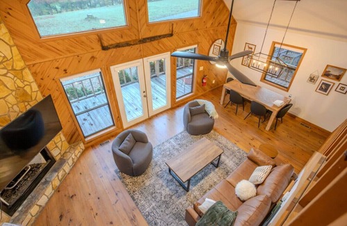 Nestled in the Blue Ridge Mountains, Cabin Blue Jay blends cozy cabin charm with mid-century modern design. Large windows frame breathtaking mountain views, especially during the vibrant fall season. Ideal for families and friends, this professionally designed retreat offers all the comforts of home while being close to town amenities.