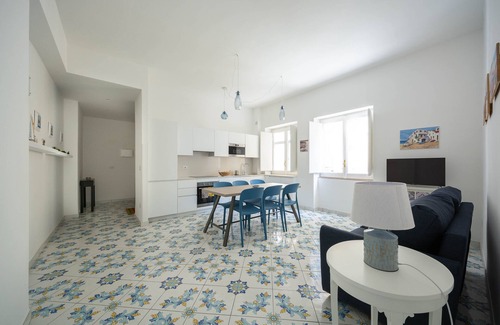 The apartment, located on the second floor of the building (with elevator), has been recently restored with modern furniture in the white and blue colors and is paved with bright majolica tiles with the typical design from Vietri. All modern comforts such as wi-fi internet access, air conditioning and satellite Tv complete this welcoming accommodation.