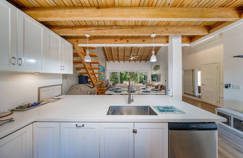Brand new Villa with open space concept. Large kitchen and lounge area with high ceilings. Front porch swing overlooking 3 min walk to West Bay beach. Large master bedroom with ensuit shower and private balcony. Living room area has a half bath next to full washer and dryer all brand new. Guest room has full bed with ensuit shower. Brand new addition was a loft with stunning window and two twin long beds that turn into a king bed together. All rooms have their own cold AC units and thermostats plus big fans. Kitchen is fully equipped with K cup and full coffee pot maker plus extra wine cooler and counter ice maker for drinks. Full fiber optics wifi with Smart Cable TV new strong wifi