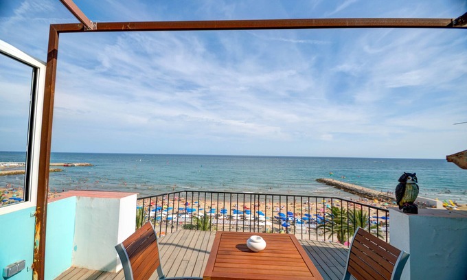 A charming and cozy apartment located on the seafront and in the center of the town, it is a privileged location. Being on the seafront makes it very sought after and special. It has a private 20m2 terrace with spectacular views, inviting you to have a drink, read a good novel, or just relax. It can accommodate 2 people, has a double bed and a recently renovated bathroom. It is fully equipped and renovated and offers everything you need for an unforgettable stay. Main features:- Maximum guests: 2