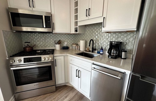 The updated kitchen is fully equipped with pots, pans, utensils, a coffee maker, a crockpot and more. You can easily prepare meals with ease (just bring your favorite ingredients) and getting started with cooking!