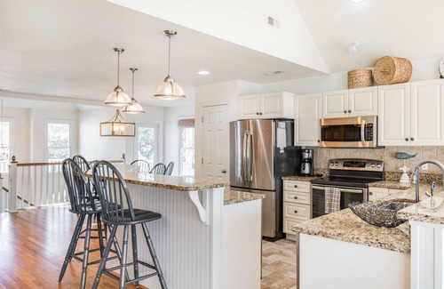 Bluebird is a beautiful home located in the gated, golf course community of The Currituck Club. This home has all the amenities you need for an unforgettable OBX vacation. Relax in your own private, saltwater pool or soak your cares away in the hot tub. The open and airy great room with the gourmet kitchen and two dining areas gives everyone a place to gather for family time and some great meals. The kids will enjoy the game room on the top level with a foosball table and TV. Find the peaceful respite you’ve been looking for on the outside decks where you can catch some awesome sunset views.