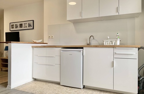 - Fully equipped kitchen (induction hobs, fridge, kettle, Senseo coffee machine, microwave...) open to the living room