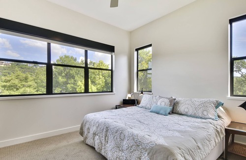 Large, bright and airy, this 4 bed and 4 full bath, 3,400 square foot modern home is on the banks of North Lake Austin with rooftop views and a private boat dock. Boat dock is not available for tie up or use of the boat lift. The large grassy grounds are perfect for playing football or finding your space for relaxation. The home is a stones skip from the waterfront restaurant Ski Shores Cafe and Marina, not far from the popular Emma Long City Park. Perfect for a retreat or family stay and less than 20 minutes from downtown Austin.