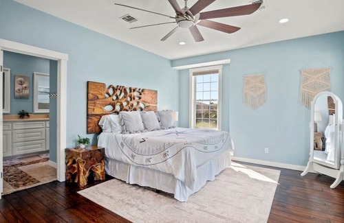 On the 2nd floor, you will find the main living space featuring an open floor concept with tons of natural lighting beaming in through the large dining and living rooms windows. The living room has a comfortable sectional couch that offers plenty of seating where you can watch cable tv or streaming services on the 60 inch flat screen tv mounted on the wall. As you enter the kitchen, you are met with an oversized island with additional seating and fully stocked cabinets and drawers with cooking essentials, including a Keurig coffee maker. The unique hand-carved wooden dining table accommodates 8. Right off the kitchen is a spacious washer and dryer room to keep your clothes clean and organized on vacation. Down the hallway, in the Master bedroom with ensuite you will find a king sized bed and television for your comfort. In the attached bathroom you have a grand walk-in shower and a deep bath tub to soak in after a long active day fishing. The master bedroom also boasts a private balcony. Across the hallway, the guest bedroom has a queen sized bed and a television, as well as plenty of closet space to hang your clothes.