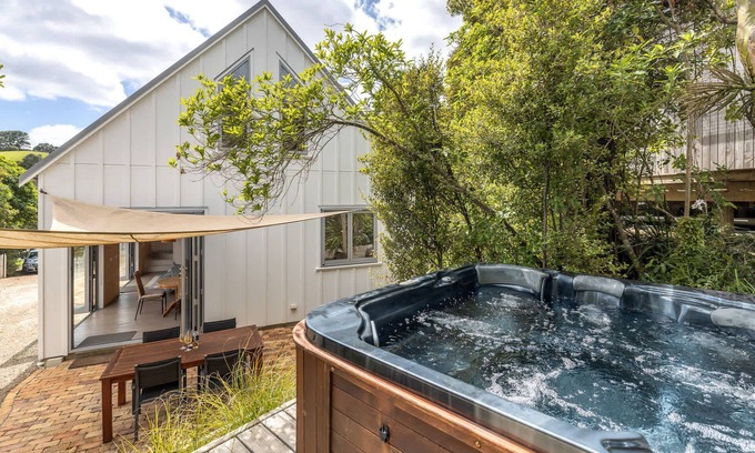 Nestled amidst lush greenery and just a leisurely 450-meter stroll to the golden sands of Onetangi Beach, this beautifully presented holiday home offers the perfect escape. Immerse yourself in the tranquility of nature while enjoying modern comforts, all within a stone’s throw of Waiheke Island’s vibrant attractions. This stunning Onetangi Beach House is a true sun-drenched haven. With ample outdoor space, it’s perfect for family fun, lazy afternoons, and soaking in the soothing sounds of birdsong. Tucked away from the road for privacy, yet conveniently close to the beach, local cafés, takeaways, and all the charm Waiheke has to offer, this is the ideal spot to relax and recharge. Step inside to discover a bright and airy open-plan living, dining, and kitchen area, seamlessly flowing onto a sunny patio and courtyard through expansive bi-fold doors. This home was designed for effortless alfresco living. Tastefully furnished, every corner exudes contemporary style and comfort. The master bedroom features a luxuriously cozy King bed, creating a sanctuary for restful nights. Upstairs, the mezzanine level offers a spacious, light-filled retreat. This versatile area has two distinct zones: one side with two single beds (convertible to a Super King) and the other with an additional single bed and a day bed, plus a desk and some bean bags to lounge on. It’s the perfect space for kids or extended family to enjoy some privacy. Unwind under the stars in your private spa pool, perhaps with a glass of Waiheke Island’s finest wine in hand. Situated within walking distance of bus stops, a handy 4 Square grocery store, Z petrol station, and three popular beachfront café-restaurants, you’ll have everything you need close by. Explore further, and a short 7-minute drive brings you to Ostend Village for supermarkets and other essentials. Oneroa Village is just a bit further, brimming with eclectic shops, galleries, cozy cafés, and even a local cinema.