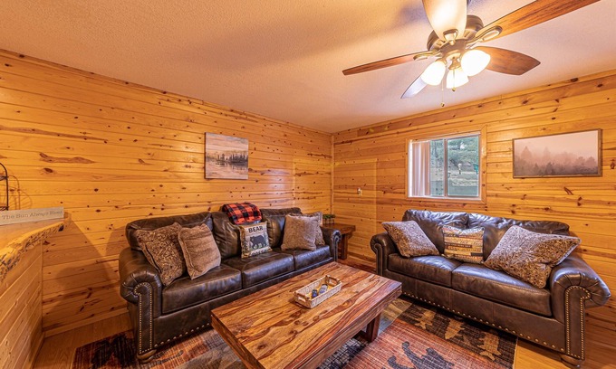 The Bobcat Bunkhouse is an updated and cozy cabin with all modern amenities needed for your getaway. It offers one furnished bedroom that includes a comfy and spacious king-sized bed. It also features a living area furnished with a queen-sized sleeper sofa and a loveseat, satellite television, private bathroom with stand in shower, fully-stocked kitchen with full size refrigerator, oven and stove, microwave, toaster, coffeepot, dishes & dishwasher, washer/dryer and detergent provided.