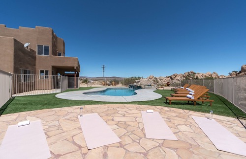 This bohemian, adobe-style home sits perched on a hill surrounded by boulders. The 360 views will make your breath away, especially during sunrise and sunset! This property has everything you need for a relaxing getaway.. spa, pool (not heated), fire pit, ping-pong, yoga mats, corn hole, tetherball, board games, and stargazing.