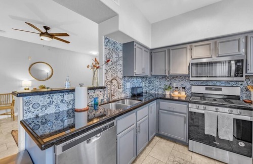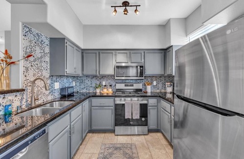 As you step in, you are greeted by a nice and open floor plan that easily leads up to a beautiful and inviting living area. Fully furnished with simple yet elegant furnitures. A massive flat screen 55" inch tv to stream and enjoy all your favorite shows and movies through ROKU, HULU, Netflix, Sling, and more. The bedrooms are furnished with brand new memory foam mattresses and luxurious linens and bedding. The kitchen is equipped with stainless steel appliances, pots and pans, and all of the basic cooking essentials to prepare a home cooked meal. We've also provided a KEURIG coffee maker and a variety of coffee or hot chocolate for you to use. A private laundry room is available inside the unit. Complimentary WIFI is available.