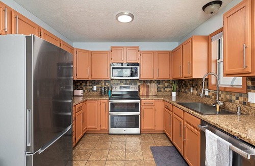 This space has been updated with modern amenities including a smart front door lock and security camera (for your safety), a Nest Thermostat, smart TV’s in every room, and Wi-Fi. You will be right at home with our comfortable living room seating and our beautifully equipped kitchen. We even have a coffee/tea station with a Keurig for your enjoyment.