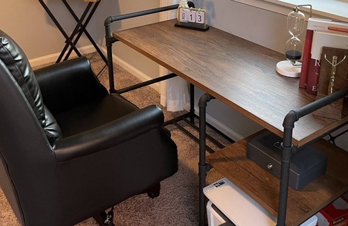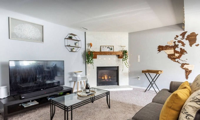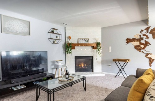 This comfy boho-chic style stay features a king size bed in the bedroom and a pullout couch in the living room. Entire space just for you! The coffee and tea bar next to the window set the mood. The study with comfortable chair helps you get focused while feeling cozy. Study also features a yoga mat, weights, a dartboard and a record player with Bluetooth so you can hit a 15 minute workout or break from study/work. Unwinding by the fireplace is so relaxing and sets the tone for a restful night.