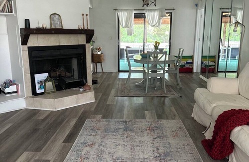 Boho shabby chic airy and spacious Florida family vacation home in trendy new Trinity area!! Perfect rough and tumble house for kids/family/pets. High vaulted ceilings make the living/ family room spacious and warm. 2 beds/2 bath (master brm+ toddler bdrm) split floor plan/large dining/room & cozy real wood burning fireplace. Large airy kitchen overlooks enormous lanai-great for letting kids or pets run wild! Full screened lanai w/ fan; outdoor grilling/dining. Fenced in backyard w/ stream for kayaking. Oversized garage.