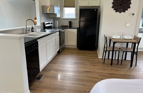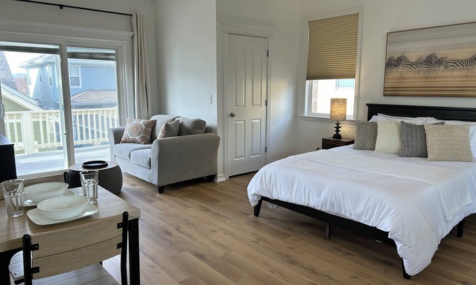 Private studio apartment with separate entry that sits behind the main residence. Light, bright and airy unit with lots of windows. Kitchen with all appliances, pots, pans, utensils, Keurig and Mr. Coffee coffeemaker. Includes full bathroom with tub, small table/desk, blackout shades and curtains, high speed internet, mounted adjustable TV with Roku and large balcony with furniture.
