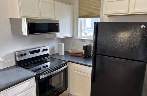 Take a deep breath and settle into this relaxed, quiet and modern space. Enjoy all the amenities of a home: keyless entry, fully-stocked kitchen with full size fridge/freezer, oven, microwave and dishwasher, Keurig and Mr. Coffee coffee maker, ample closet space, washer and dryer, mounted TV with Roku that can be pulled out and turned to watch in bed, and a queen size Zinus 12 inch Green Tea Memory mattress. Also includes a large balcony where you can sip your morning coffee or have a meal.