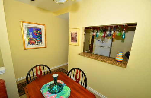 There is a breakfast room, complete galley kitchen, guest bedroom, bath with tub / shower and large L shaped living room on the ground floor. The master suite on the second floor has a sitting area, flat screen TV and a complete bath with walk in shower. The furnishings are DELUXE; this is not your ordinary rental condo (free secure WiFi, three flat screen TV's, CD player, radio, IPod hook up, DVD players with movie library & washer/dryer). Oriental carpets and a great variety of artwork add to the relaxing atmosphere. The outdoor deck has a dining table for six, hammock and a lounge chair for sunning. Boli's pool, is a one minute walk from the front porch, only a splash away!