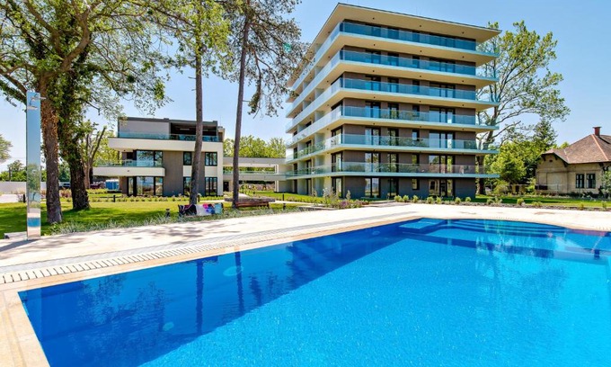 Bonnie-Premium Lelle Waterfront Private Apartment offers accommodations in Balatonlelle, a 4-minute walk from Szabadstrand and 30 miles from Bella Stables and Animal Park. This beachfront property offers access to a balcony, free private parking, and free Wifi. The apartment features an outdoor swimming pool and an elevator. The air-conditioned apartment consists of 1 bedroom, a living room, a fully equipped kitchen with a dishwasher and a coffee machine, and 1 bathroom with a bath and slippers. Towels and bed linen are available in the apartment. This apartment is allergy-free and non-smoking. Guests at the apartment will be able to enjoy activities in and around Balatonlelle, like hiking. A children's playground is also available at Bonnie-Premium Lelle Waterfront Private Apartment, while guests can also relax in the garden. Zamardi Adventure Park is 20 miles from the accommodation, while Strand Fesztivál is 21 miles from the property.