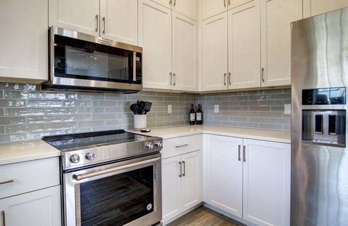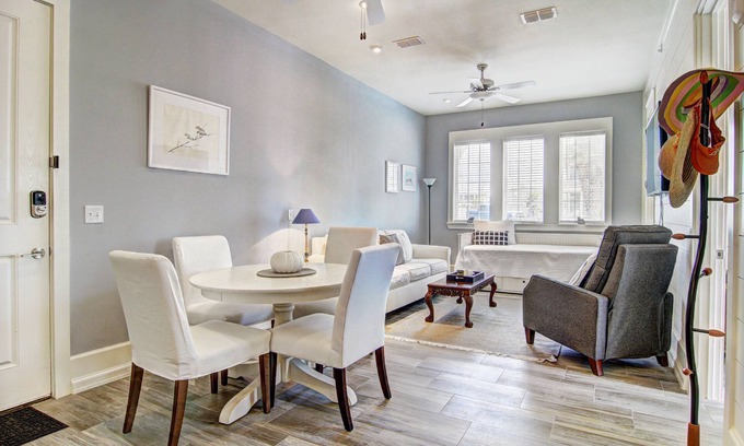 MAIN LIVING SPACE: The open-concept space combines kitchen, dining, and den, creating a comfortable place to return after beach or pool time. A beachy, all-white sofa faces a wall-mounted, flatscreen TV, while a daybed under the window offers room for guests to watch a movie or stay the night. A round dining table seats 4 for card games or a meal. The all-white kitchen features stainless appliances and has everything you need for prepping snacks, sunset cocktails, or a seafood supper.