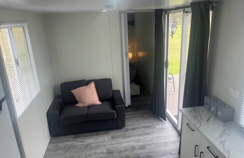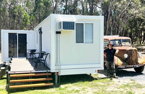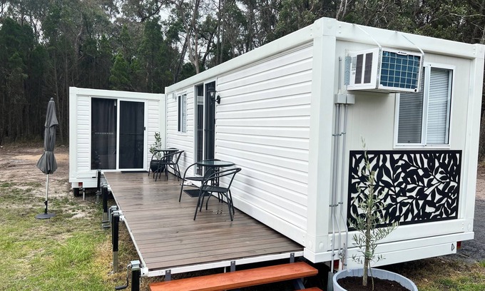 Stylish 2 bedroom Eco friendly tiny home, queen beds, smart TV, air con, pet friendly, fridge, microwave, hot plates, deck, fire pit, 10 mins to central Stanthorpe, Opposite Ravenscroft Vineyard, view