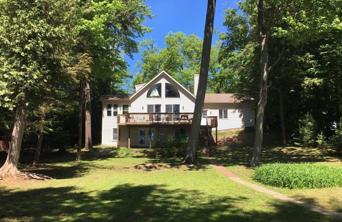 This spectacular rental is a natural oasis from a busy world, yet accessible to many of northwest Michigan's popular tourist destinations. The house can sleep up to 10 people comfortably. The master bedroom is a loft area with view of the lake with king bed and private bathroom. The main level has 2 private bedrooms both with Queen beds and 1 shared bathroom. The finished lower level of the house has a private kids bunk room and a pull out couch with queen bed in the entertainment room with a full bath on that level.