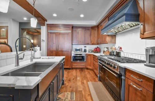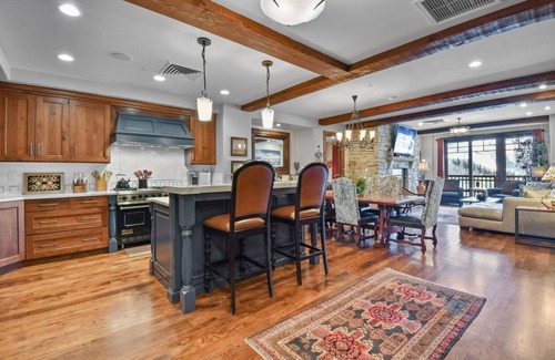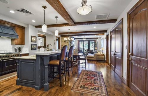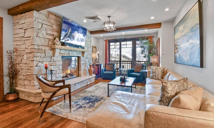Discover a whimsical mix of mountain décor, contemporary furniture, and luxurious finishings inside this single-story condo. Whip up everything from romantic dinners to boisterous family breakfasts in the chef’s kitchen, equipped with top-of-the-line Viking appliances. The dining table has seating for 6, with an additional 2 seats at the breakfast bar. A leather L-shaped couch and 3 armchairs surround the large stone fireplace and 65” TV in the living area. Luxuriate with a quiet night by the flickering flames with cocktails or cocoa as snow dusts the mountains out the picture window! Enjoy a restorative night’s rest in both the primary and guest bedroom, each featuring a king bed, private bathroom, and Smart TV. Additionally, the primary boasts a private patio—wake each morning and step outside to the fresh mountain air!