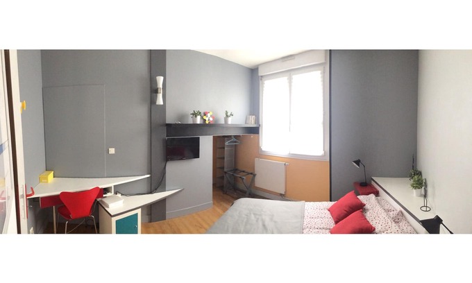 Bed and breakfast with private entrance for 1 couple (or 1 family with extra), 1 quiet master bedroom on a 140 cm courtyard, 2 bunk beds in hallway *, 1 private bathroom with shower, double sink and wc. Breakfast to be taken in the room (Dolce Gusto machine), fruit juice and pastries provided. An ideal location in Bordeaux for strolling along the quays while watching the liners pass, eating out, shopping at the Quai des Marques. Right next to Cap Sciences, the Chaban-Delmas Bridge, the World Wine City, the Mer Marine Museum and Hangar 14 (exhibitions, salons), the Inseec and Vatel Schools. The building is at the foot of the tram station "Hangars", 4 stations from the hyper center, Quinconces, Cours de l'Intendance, pedestrian street Ste Catherine, the Grand Theater and the famous Chartrons district (antiquity, flea).