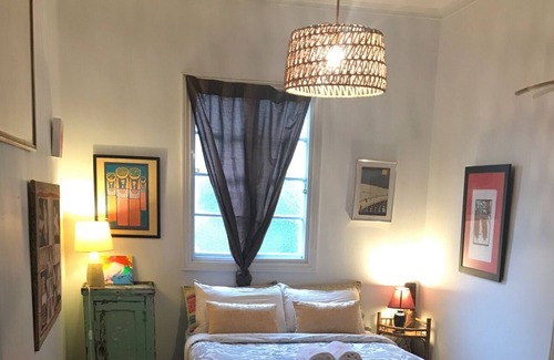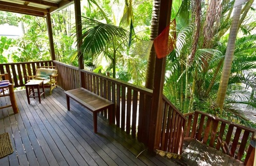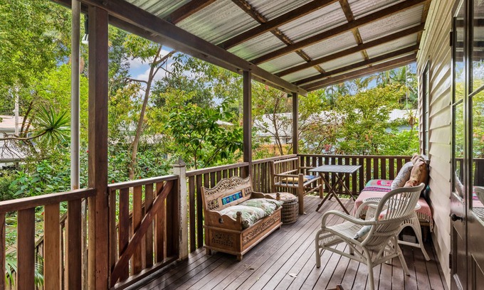 Bohemian style Queenslander Home, lovely private spaces with covered verandas and large bedrooms. Eco friendly rainwater tank, filtered drinking water, gas stove, solar power, energy saving fittings and lush garden. Fully equipped kitchen and covered parking. Pet Friendly.