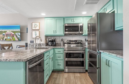 This studio has a private balcony that overlooks the tropically landscaped pool area where you can sit and watch a beautiful sunset and the Corpus Christi lights come to life at night. With 550 square feet this studio has a king sized bed and a twin size sleeper and will accommodate 3 people. With a fully equipped kitchen and a full bath you should have everything you need to make your stay comfortable. With the beach just steps outside the front door, you can enjoy the best of both worlds.