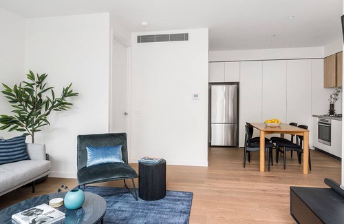 The apartment building showcases a modern, architecturally designed exterior, plus promises sustainable living, with a 6-star energy rating and grey-water system. The interiors are also modern, with timber floors, black framed glass and luxe, contemporary styling. Enjoy open plan living and dining, a well-equipped kitchen with high-end appliances, modern bathrooms, Euro laundry and 2 light-filled bedrooms. Mod cons include complimentary wifi and Netflix, plus ducted heating and cooling.