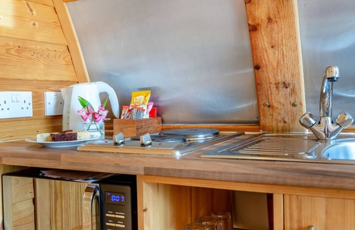 Stylish and specially designed to be snug at any time of year, this canine-friendly couple’s retreat features a contemporary open-plan layout with good head height, golden pine cladding and a flow of natural light through French doors to one end. After a busy day outdoors, return to find all the must-haves of home: a compact kitchen where you can prepare a hearty meal, a dining suite with space to spread out maps and guidebooks, and a sofa where you can stretch out to watch TV while the dogs snooze at your feet. When your day is done, it’s just a few paces to your double bed and shower room. A furnished decking area at the front of the pod extends your living space, while the wow-factor wood-fired hot tub is perfect for a chill-out session.