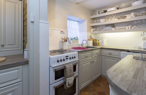 The galley-style kitchen leads off the dining room and although small in size has everything you need for a self-catering stay with an electric oven and hob, fridge-freezer, and a dishwasher. The pale grey design adds to the feeling of light and space. There's a tiny tea making nook squeezed in as well.