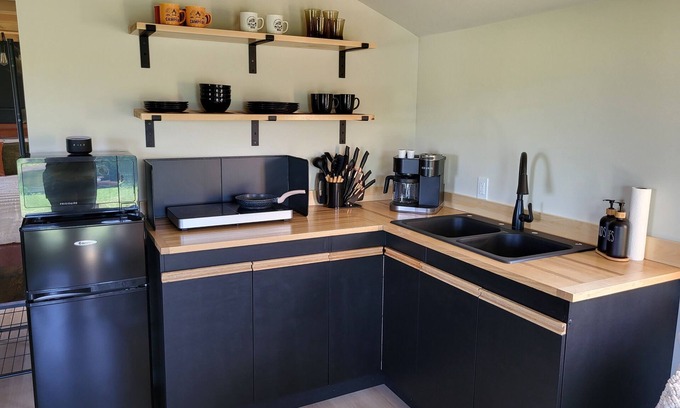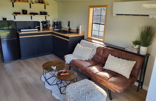 Bear Creek Hideaway is BRAND NEW. This modern and cozy hideaway, provides the perfect sanctuary for your escape and relaxation. Thoughtfully designed for either a solo journey of self-love and reflection or where couples can reconnect and rejuvenate together. Whether you crave intimate moments by the fire gazing out at the river's gentle flow, basking in the sun, or being adventurous on the river itself with our kayaks & paddleboard, this idyllic spot caters to all desires.