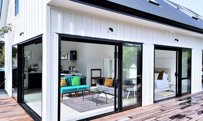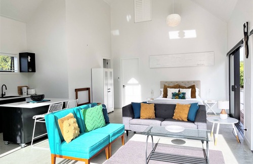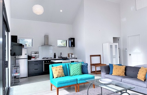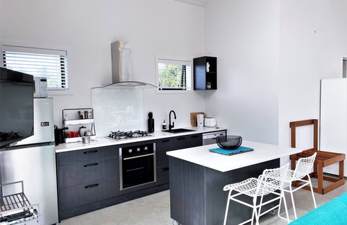 Brand new self-contained studio apartment, with high vaulted ceiling and skylights adding to the sense of space. Full kitchen facilities, lovely bathroom and super-comfy bed. Huge decks looking out to lush tropical gardens. set in a private position at the rear of the former village church (now also boutique accommodation). Located midway between the hotspots of Omaha & Matakana. Stroll to esplanade reserve for a relaxing dip in warm harbour waters or relax with a great coffee or superb fish & chips from the Dairy on the corner.