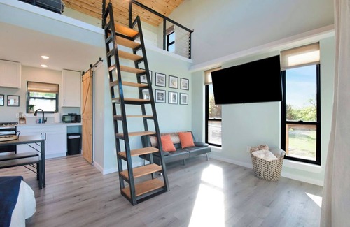 The ground floor has a Murphy bed and futon couch for sleeping and a king-sized bed in the loft.