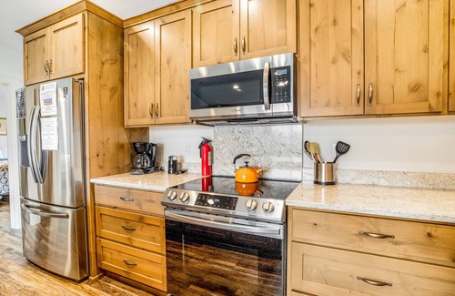 Inside, discover a sunlit interior with all the comforts of home. Whip up delicious dishes in the sparkling full kitchen, configured with stainless steel appliances and ample stone counter space. Find a mini-split AC unit in the living area and each bedroom. A private washer/dryer adds convenience to longer stays.