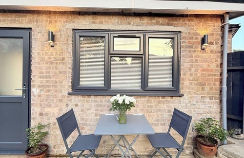 Modern luxury 1-bed studio flat, with private access and outdoor patio and seating area.
