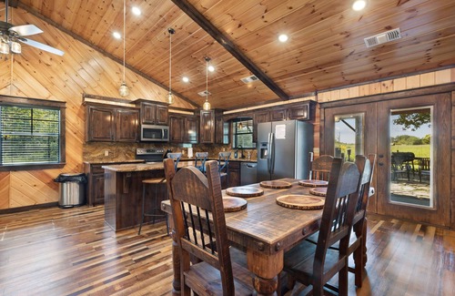 The Agape Shack is a 1700 sq ft, 3 bedroom, and 2 bathroom cabin set on 1 acre. You'll find a comfortable and spacious living room, open kitchen, romantic gas fireplace, and a walk-through tiled shower in the master bath. All 3 bedrooms have smart TV's, along with a big screen TV in the living room. The fully equipped kitchen offers plenty of room for entertaining. The back porch has a gas/charcoal grill, hot tub, and a beautiful meadow view, with a patio and dfire pit . Boat and ATV parking is abundant, and pets are welcome. The Agape Shack is all you will need for a relaxing stay