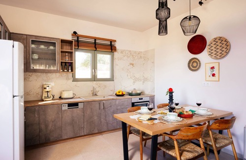 Well, it's time to let your imagination and thinking, free to dream. It's time to book Lily's Villa Lemonia. It’s a brand-new villa , thoughtfully designed to harmonize with the natural beauty of Crete and the serene colors of the surrounding olive trees. It features two bedrooms, each with its own en-suite bathroom, plus an additional ground-floor bathroom with laundry facilities. The open-plan living area includes a sofa that converts into a double bed, a large flat-screen TV, and stunning views of the enchanting garden. The fully equipped kitchen boasts modern appliances, ensuring convenience and style.
