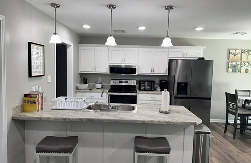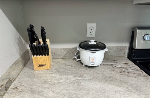 Enjoy the convenience of modern amenities including a fully equipped kitchen with a refrigerator, oven, stove, microwave, air fryer, rice pot, Keurig coffee maker, and dishwasher. We provide pots, pans, dishes, and silverware for your convenience. Relax in the spacious living room with cozy sofas, a bar with 2 stools, and a dining table. Each room comes with a TV featuring Netflix and Roku, along with high-speed WiFi for all your streaming needs.