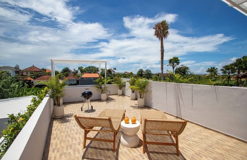 Escape to paradise in Canggu! Our brand-new villa boasts a spacious open kitchen, inviting pool, and dedicated BBQ area, ideal for shared moments. Relax on the rooftop terrace with breathtaking views, then unwind in one of 3 bedrooms with luxurious bathrooms.