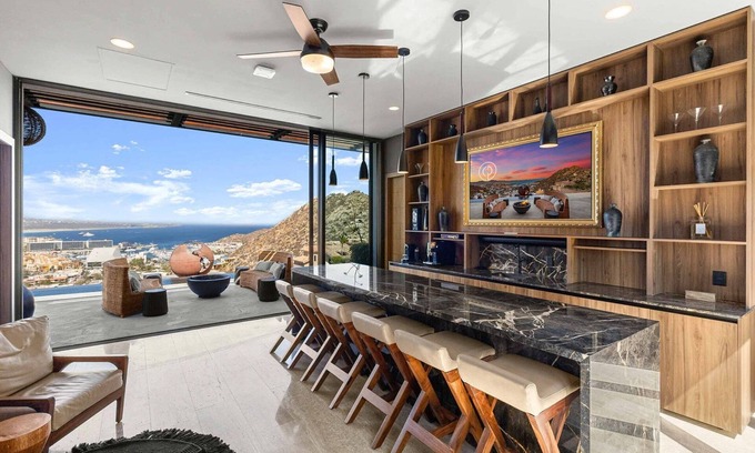 Experience coastal luxury redefined at Lucia Noir, an exquisite 8-bedroom sanctuary meticulously crafted to embody the essence of Cabo living. With a backdrop of breathtaking ocean views, this opulent retreat seamlessly combines sophistication and comfort. The captivating color palette, featuring rich aztec gold, smoky black, and crisp decorators white, infuses the space with boldness, modernity, and uniqueness, setting Lucia Noir apart as a truly unparalleled destination in Cabo. Nestled within Pedregal, Cabo's historic rental community, Lucia Noir offers easy access to the city's vibrant energy while providing a private oasis for relaxation. Enjoy leisurely strolls to the marina, indulge in fine dining, or take advantage of nearby amenities such as the community cafe and tennis courts. Step into an atmosphere of refined elegance as teak and cedar finishes mingle with onyx and granite countertops, elevating every aspect of your stay. From the gourmet chef's kitchen to the detached butler kitchen, every detail is designed to cater to your needs seamlessly. Relax by one of two swimming pools during sunny days, and unwind in the jacuzzi amidst panoramic city lights at night. With personalized services including a Gourmet Chef Team, Daily Butler Service, Housekeeping Team, and Personal Concierge, Lucia Noir ensures an extraordinary experience from start to finish.