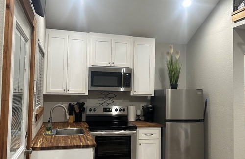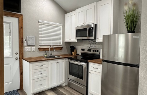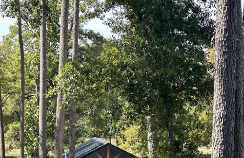 Kick back and relax in this calm, stylish space. Newly constructed open floor plan cabin with queen bed and two twin beds in the loft, linens and pillows provided. This open concept has everything you need for a peaceful getaway. The kitchen is fully furnished with refrigerator, stove, oven, microwave, toaster and a Keurig coffee maker. It is also supplied with 1 paper towel roll, dish rags and towels, plates, cooking utensils, cookware, bakeware like cookie sheets and pizza pan, glasses, wine glasses and coffee mugs. Bathroom is supplied with 1 roll of toilet paper, 8 towels, 10 rags, 6 makeup rags, and 3 hand towels. Outdoor seating area has park style grill, firepit and four Adirondack chairs. Back porch has two chairs with a table, wonderful for morning coffee with views of the pond, fishing pier, and deer feeder. A great place to watch wildlife.