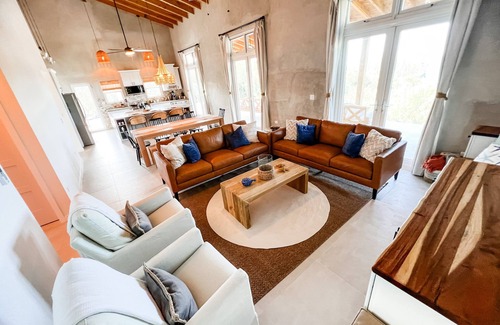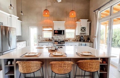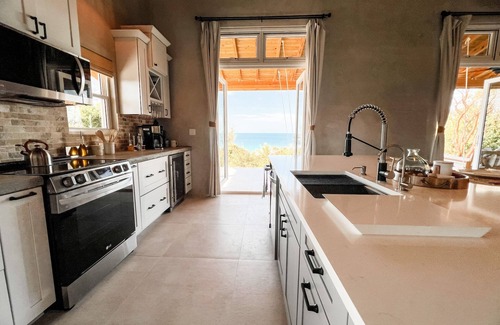 Enter the house into the great room with its 18-foot valued ceiling, and you will be greeted by three sets of French doors that open to the ocean view. To the left is a fully equipped kitchen featuring stainless steel appliances, and a wine & coffee beverage station including a beverage cooler and ice maker. Enjoy fresh water and ice with our RO water system! The sink, dishwasher, and undercounter icemaker rest under a large quartz countertop island with barstool seating. There is plenty of counter space to prepare food while entertaining your guests.