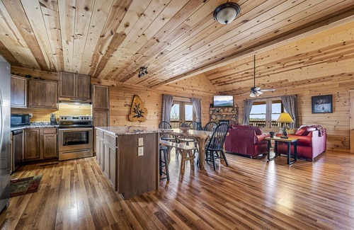 The dining area that actually seats 6 people comfortably with a eat at bar, and a large living area with flat screen TV , WiFi with all the streaming channels you need for family enjoyment. Bedding consists of 2 king bedrooms and a set of bunk beds (full and a twin on top). Nice game room with Pool table and Arcade unit including large screen TV. All bedrooms are complimented with flat screen TV's as well. All TV's are equipped with all the streaming channels through ROKU. Step out onto the extra - large wrap around deck on the main level and take in the outstanding mountain views offered and relax in the hot tub after a long day of activities and enjoy the rockers and hammock available complimented with large table and chairs to take in the outside atmosphere and the surrounding beauty that awaits you in the Smoky's Den.