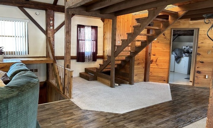 This old ice Barn has been converted into a loft style unit with over an acre out back for parking trailers and off road toys . The beautiful hand carved beams and wood pellet stove add charm .
