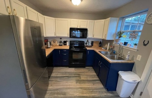 Shotgun style home features 3 bedrooms, sitting area, bathroom, laundry, and eat in kitchen. Entire home is newly remodeled. Deck has patio furniture for outdoor dining and a fire pit. Yard is not completely fenced so dogs will need to be leashed but not tethered. There is a security camera on the front and back porch. Steps are required to enter the home but once inside, it is all 1 level.