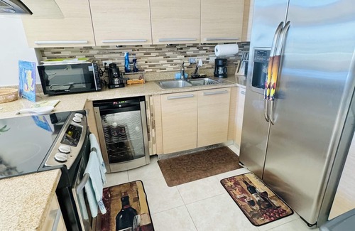 It is a 2 bedroom, 3 bathroom, duplex beach condo that is equipped with most of the modern conveniences that you would expect at your regular home - namely, a Two-door Stainless Steel refrigerator, microwave oven, stove, flatware, silverware, pots and pans, a wine cooler, a hood that serves as a smoke extractor, 3 TV sets, 2 DVD players, 3 A/C units, water heater, Washer/Dryer, Iron, Ironing Board, Hair Dryer, Jacuzzi, towels, linens, etc.